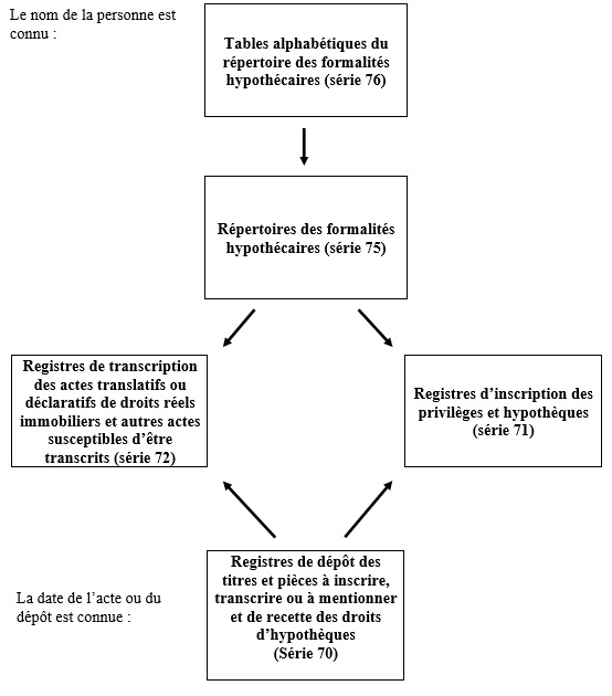 L'accès à cette série se fait via la référence de transcription, c'est-à-dire le numéro du volume et de l'acte dans ce volume. Cette référence peut être trouvée dans le répertoire des formalités hypothécaires, page de gauche, ou dans les actes postérieurs relatifs au même bien immeuble. Il s'agit d'une des méthodes les plus faciles pour débuter des recherches car un seul acte peut faire connaître la référence aux actes qui précèdent et les numéros d'articles du répertoire des formalités hypothécaires pour les personnes qui sont intervenues dans l'acte.