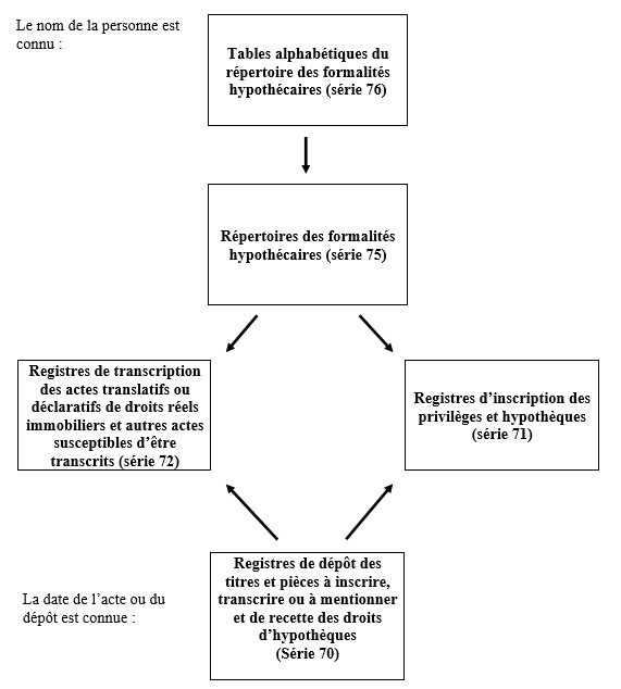 L'accès à cette série se fait via la référence de transcription, c'est-à-dire le numéro du volume et de l'acte dans ce volume. Cette référence peut être trouvée dans le répertoire des formalités hypothécaires, page de gauche, ou dans les actes postérieurs relatifs au même bien immeuble. Il s'agit d'une des méthodes les plus faciles pour débuter des recherches car un seul acte peut faire connaître la référence aux actes qui précèdent et les numéros d'articles du répertoire des formalités hypothécaires pour les personnes qui sont intervenues dans l'acte.