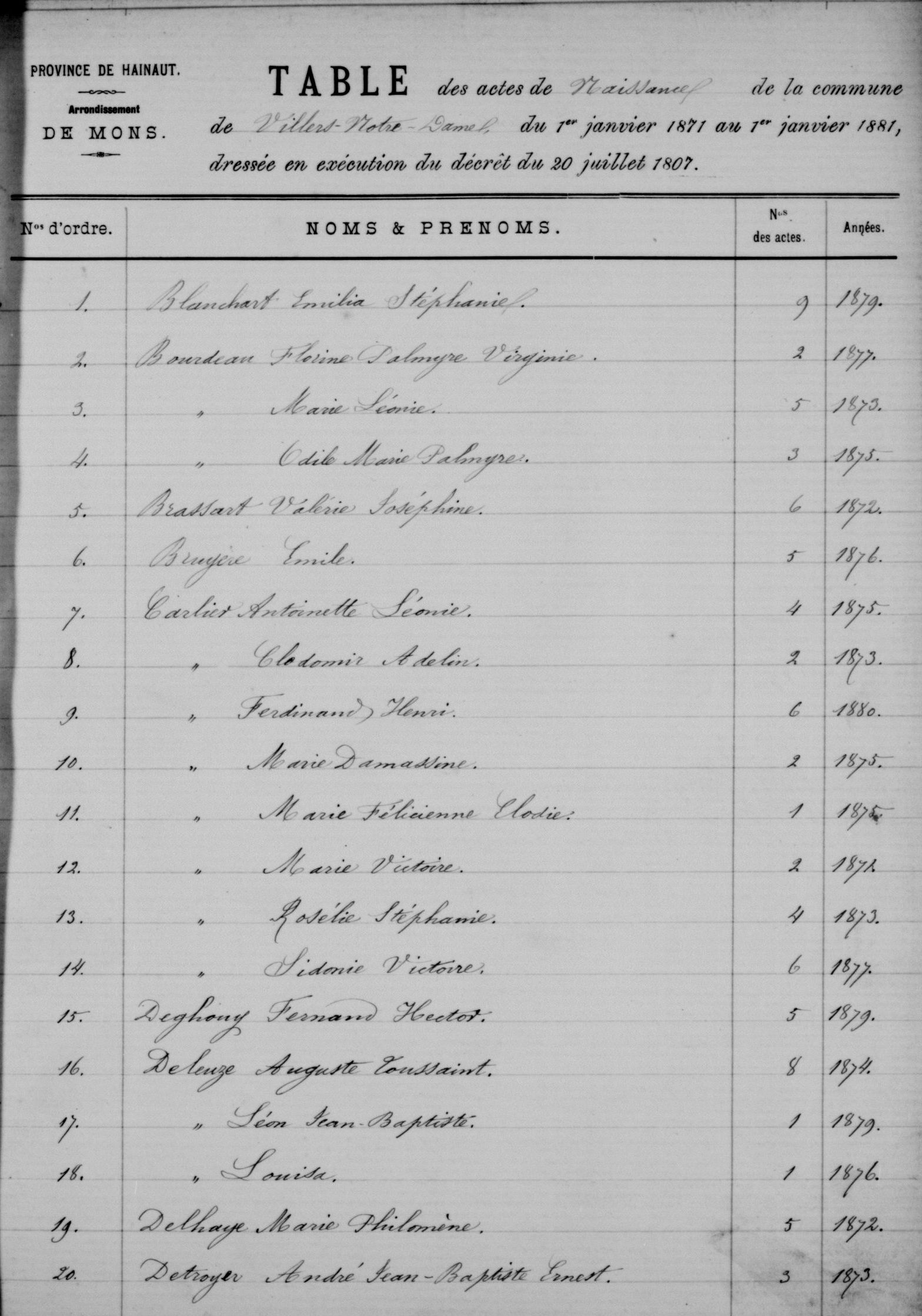 Annuellement, des index alphabétiques sont dressés pour les actes de l’état civil. Sur base de ces index, le greffe du tribunal réalise ensuite les tables dites décennales (1851-1860, 1861-1870, etc.). Les index, qui sont également disponibles en ligne, sont un outil très pratique, bien qu’ils ne soient pas toujours alphabétiques mais classés sur base de la première lettre du nom de famille.