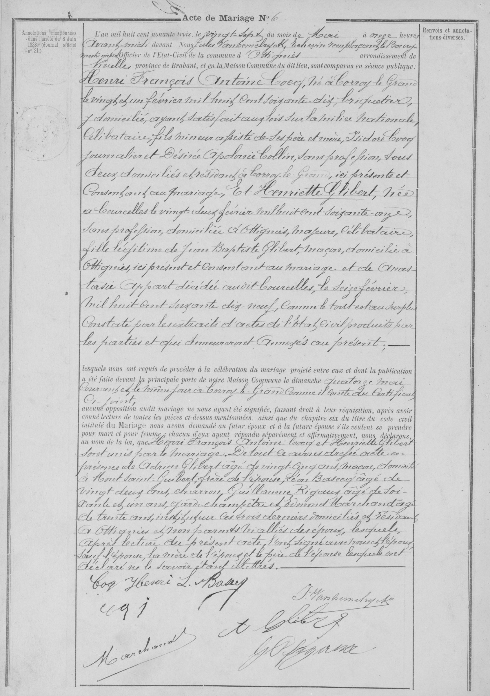 Un acte de mariage contient les noms, prénoms, professions, âges, dates, lieux de naissance et adresses des futurs époux. Les noms, prénoms, professions, âges et domiciles des parents sont également repris. À noter que si un contrat de mariage a été établi, l’acte mentionne le nom du notaire.
