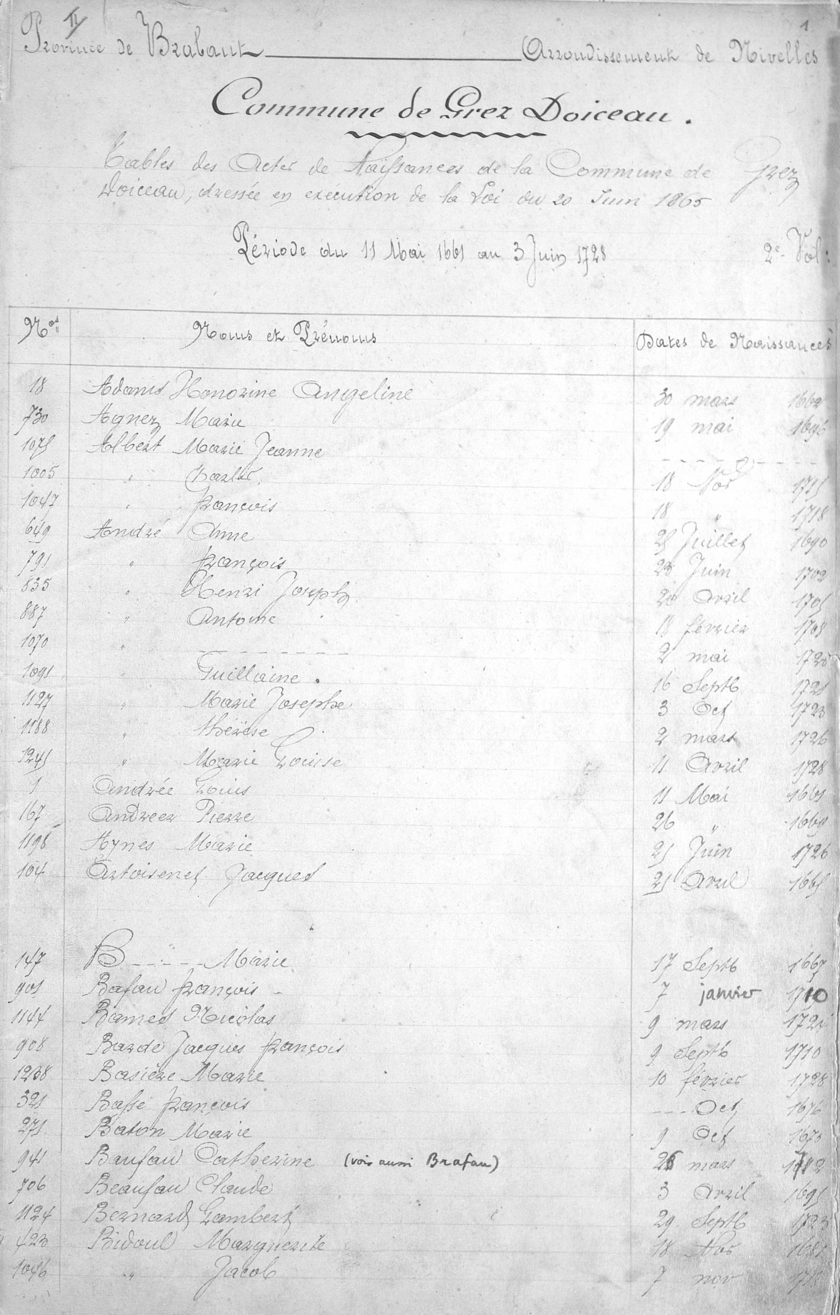 Annuellement, des index alphabétiques sont dressés pour les actes de l’état civil. Sur base de ces index, le greffe du tribunal réalise ensuite les tables dites décennales (1851-1860, 1861-1870, etc.). Les index, qui sont également disponibles en ligne, sont un outil très pratique, bien qu’ils ne soient pas toujours alphabétiques mais classés sur base de la première lettre du nom de famille.